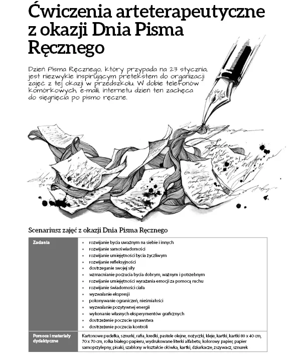 Kontynuując temat podjęty w poprzednim numerze czasopisma „Wychowanie w Przedszkolu”, publikujemy ćwiczenia arteterapeutyczne i scenariusz zajęć z okazji Dnia Pisma Ręcznego, służący kształtowaniu umiejętności wyrażania emocji za pomocą ruchu, pokonywaniu ograniczeń i nieśmiałości oraz rozwijaniu samoświadomości u podopiecznych.
